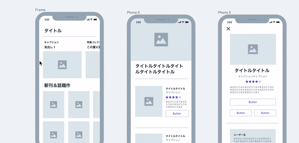 一見すると物足りなさを感じるかもしれませんが、制限があることで、細かい色味や具体的な装飾などワイヤー段階で考慮しなくていい部分を「作り込む」ことを防ぐことができます。結果として、ワイヤーフレームの本来の役割である画面の構成要素であったり情報設計に意識を向けることができます。