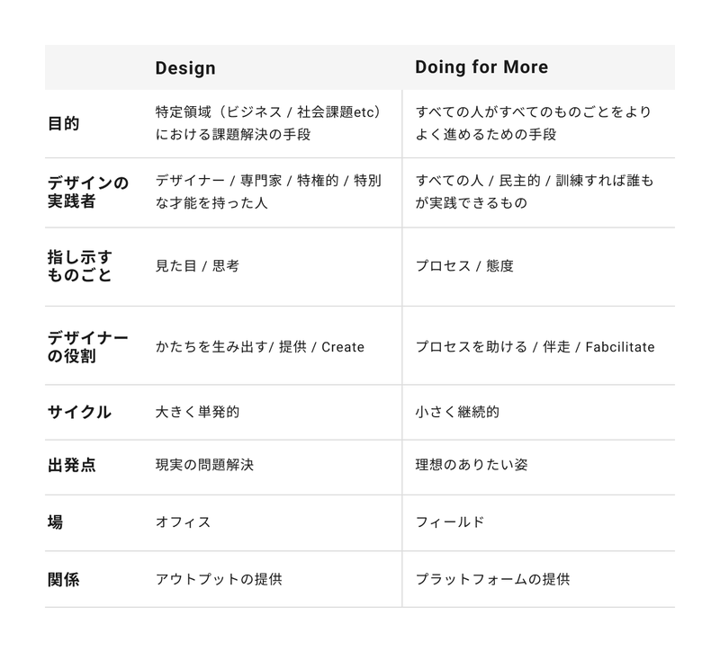 不確実なもの、曖昧なものをそのまま受け入れ、実践を繰り返す中から精度を高めていくこと。 固定観念に囚われず、無知の知を認識し、現場にあるものごとに真摯に向き合い、共感と直感を元に真に必要とされるものに近づくこと。 さまざまな感覚を活用し、本当に驚きや喜びのある体験を生み出すこと。 遊び心やユーモアをもって、ものごとに愛着の感じられるような親密さを生み出すこと。 矛盾する様々な視点や情報を総合し、より高次なものへと変化させていくこと。 Design Doing for Moreの定義 こういった「デザインに対する姿勢」をデザイナーだけのものとせず、事業づくりに関わる関係者すべての共通認識としていくことで、「組織としてのデザイン実践」へつながっていくと考えています。