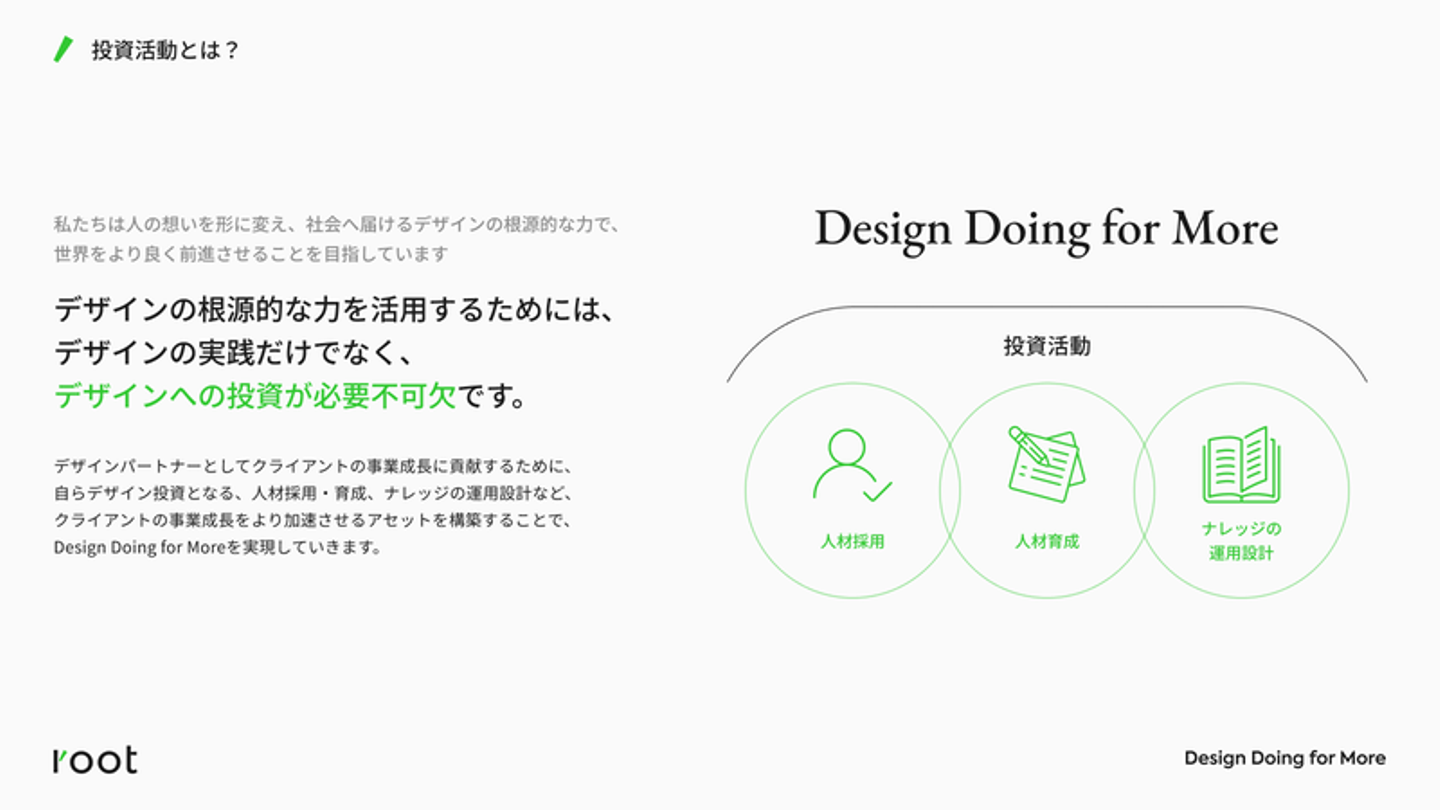 事業が成長して大きくなっていくことに比例して、デザイン投資量を増やしていく企業が増えていけば、結果的にはrootの「Design Doing for More〜デザインの実践を個から組織・事業へ〜」というビジョンの実現に近づくと思っています。