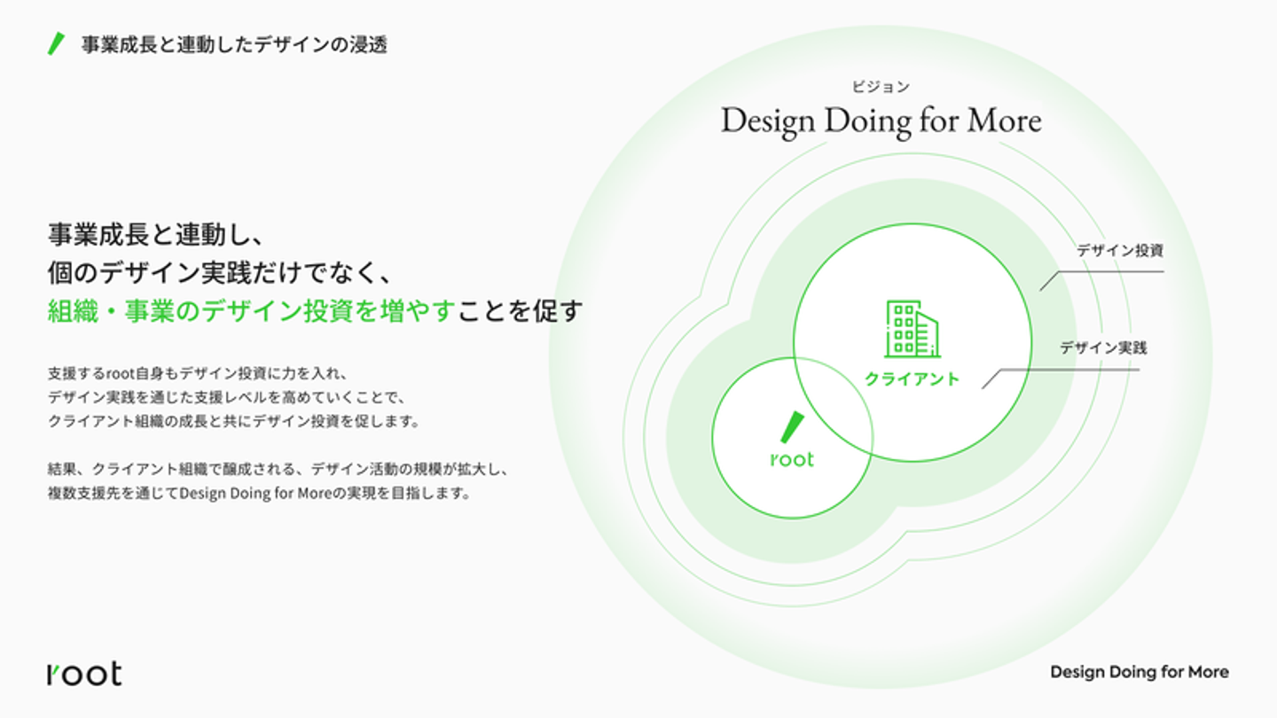 rootは「Design Doing for More〜デザインの実践を個から組織・事業へ〜」というビジョンを掲げています。具体的には、組織や事業にデザインを活用できる事業者を増やしていくことをミッションに、デザイン組織立ち上げの支援などを行っています。