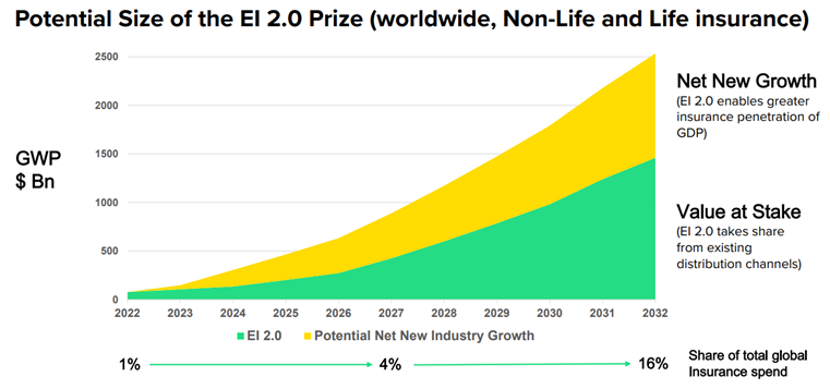 世界で注目されている「組込型保険」ですが、2022年6月に発表された「EMBEDDED INSURANCE PEER GROUP REPORT - JUNE 2022*1」では、2032年に世界全体で保険料が2.5兆ドル(約363兆円*2)に達する見込みです。