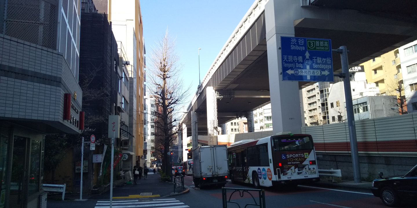 オフィスまではひたすら直進なので迷うことはあまりないかと思いますが、とにかく高速道路沿いに歩けば間違いありません。道路標識だと渋谷方面ですね。