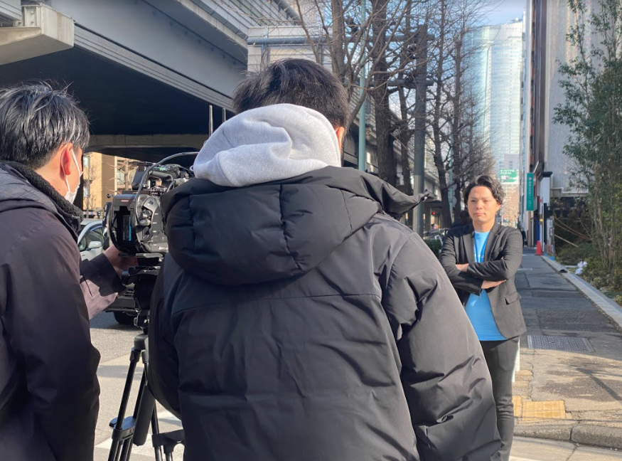 こちらはオフィス前の撮影風景。この日は気温も低く寒さが厳しい日だったんですが、水野が薄着で頑張ってくれました笑!