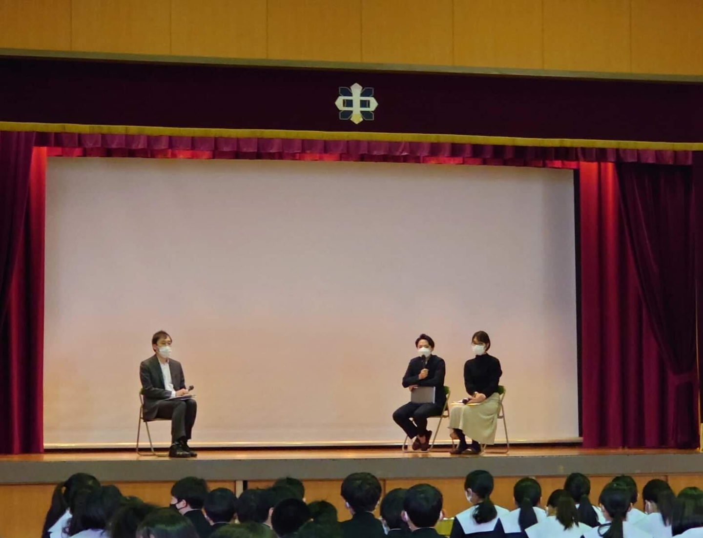 講演の様子はというと、写真の通り舞台の目の前に二年生の生徒さんたちがズラっと!!水野いわく、色々な場所で話してきたが、今回が1番緊張したかもしれないとのことでした笑