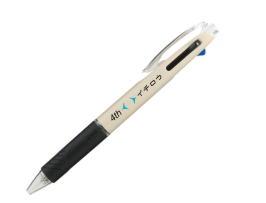 ↓こちらがイチロウペンです。現場で使っていただけるものということで、ロゴ入りのジェットストリーム3色ボールペンを作成しました。