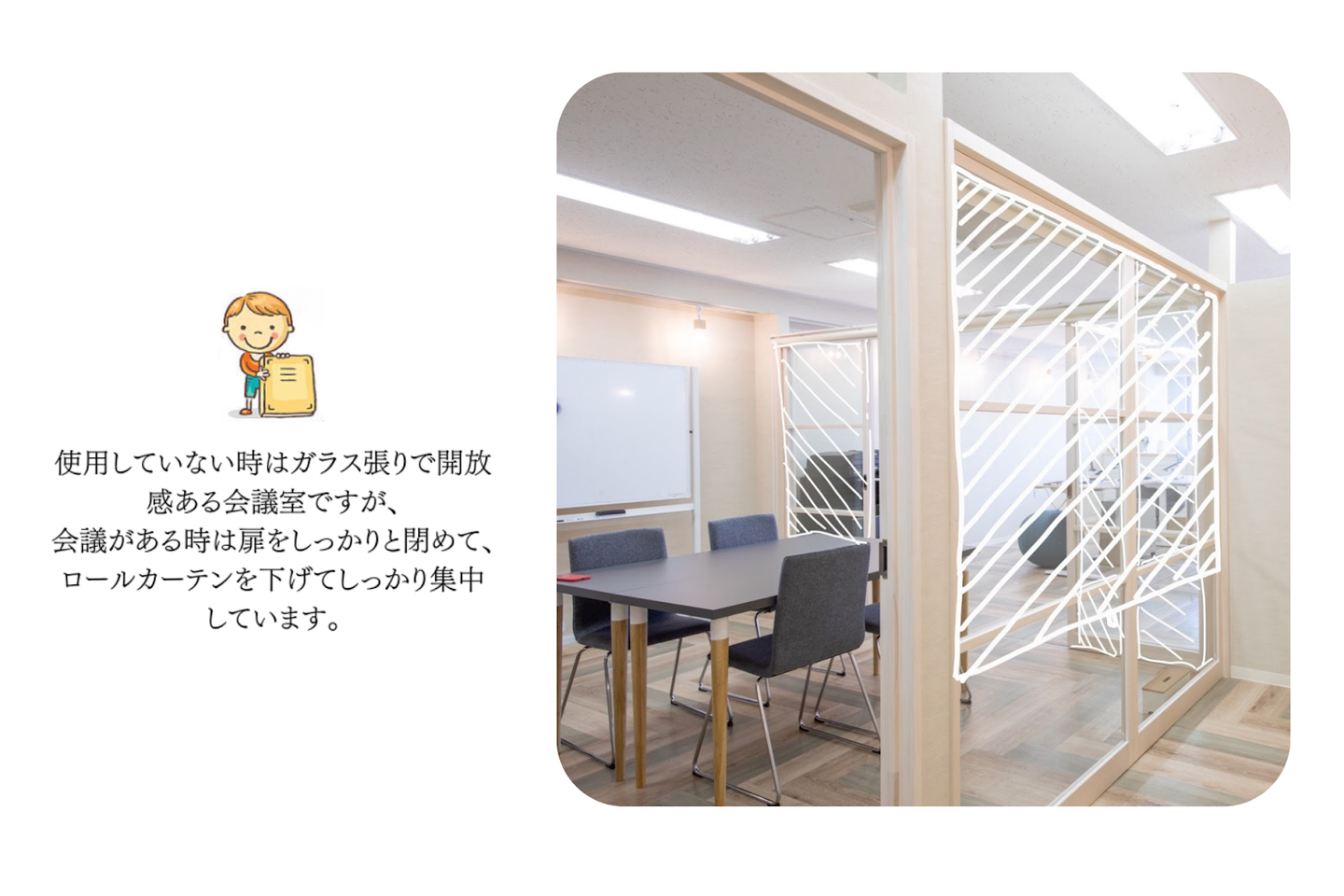 ここではお客様との商談・打ち合わせ・社内会議で使います。