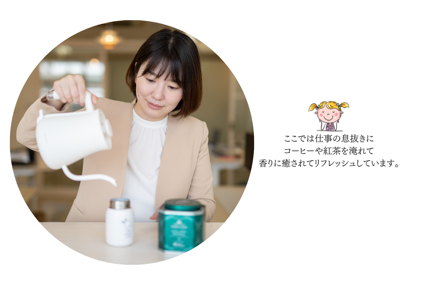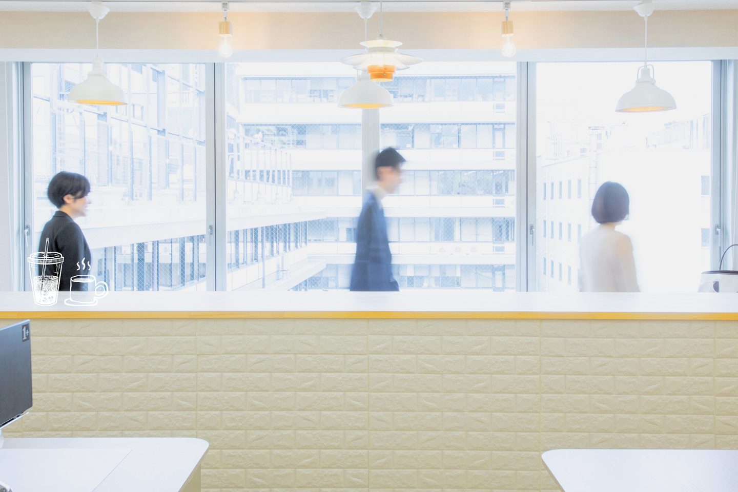 この2つの空間はリラックスできる『カフェ』をイメージしており、オープンに業務の話ができるようにしています。
