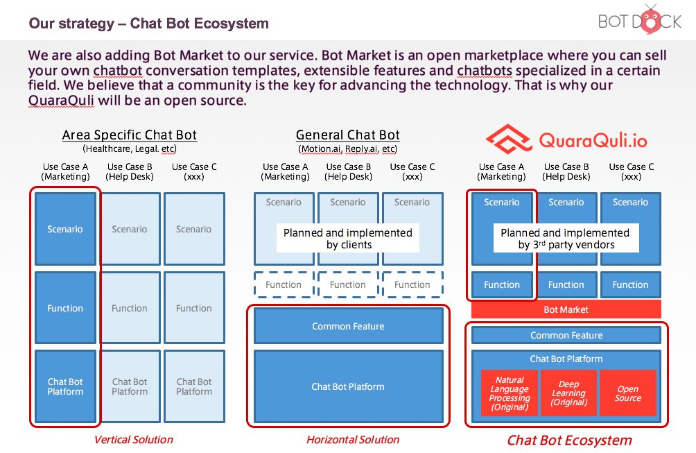 スライドも追加したおかげでだいぶ反応が変わり、いくつか具体的な引き合いをいただくことができました。例えばメンタルヘルス対策のチャットボットサービスを運営している創業者の方は、心理学者の方でした。多くのクライアントの悩みを解決するためにチャットボットサービスを始めたのに、今悩んでいるのはボット開発のリソース不足だと言います。本来はどのようなコーチングセッションを行うべきかというサービス設計、UX Designに時間をかけるべきですよね。こういった企業がQuaraQuliを使うことで、簡単に新しい顧客体験を生み出し、しかも弊社のマーケットプレイス上で企業向けに販売し、その従業員が利用できるようになるわけです。帰国後すぐにSKYPEミーティングを進めていくことが決まりました。