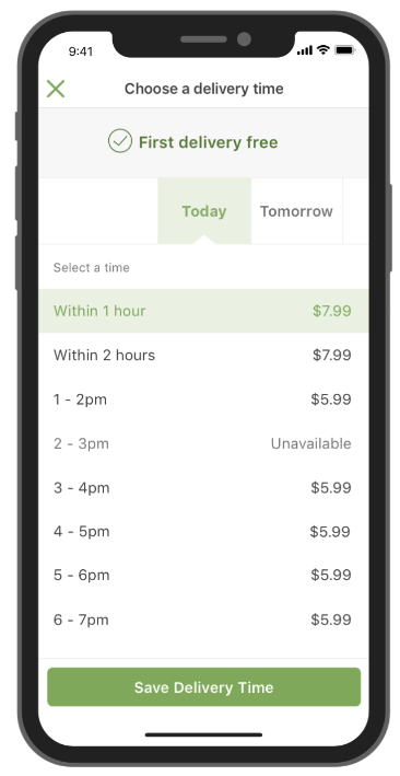 ここに問題があります。 Instacartのショッピングカートに商品を追加した後、顧客はチェックアウト時に配送ウィンドウ(配送の時間)を選択することができます(図1参照)。 その後、Instacartのshoppersは、注文通りに届けようとします。 混雑する時には、当社のシステムでは、処理できる注文数よりも多くの注文を受け入れ、遅れて注文するものもありました。