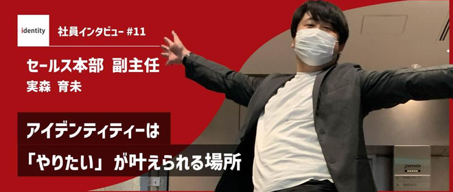 東証一部上場企業の子会社になり、益々勢いを伸ばすアイデンティティー!!今回はセールスハブ部のメンバーであり、『いくみん』こと実森育未さんにインタビューいたしました。実森育未という人間を丸裸にしたインタビューと、フォトジェニックな写真がたくさんある記事になっておりますので、是非最後まで目を通してください。前回の記事はこちら→https://www.wantedly.com/companies/id-entity2/post_articles/328162島田:まずは、簡単に自己紹介をお願いします。実森:YES!・・・失礼しました。先日、岡崎体育さんのYoutubeのパロディー動画を撮ったの...