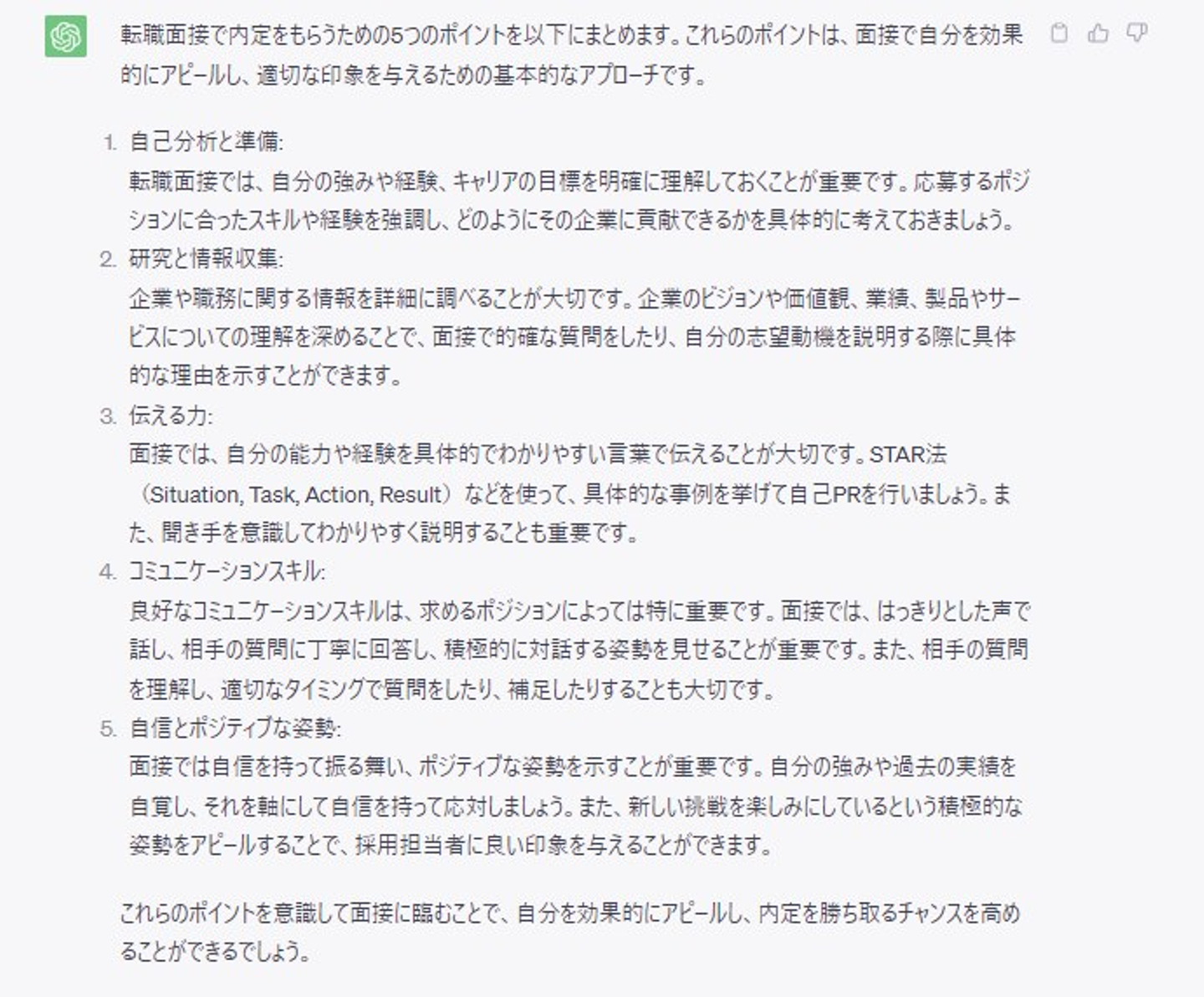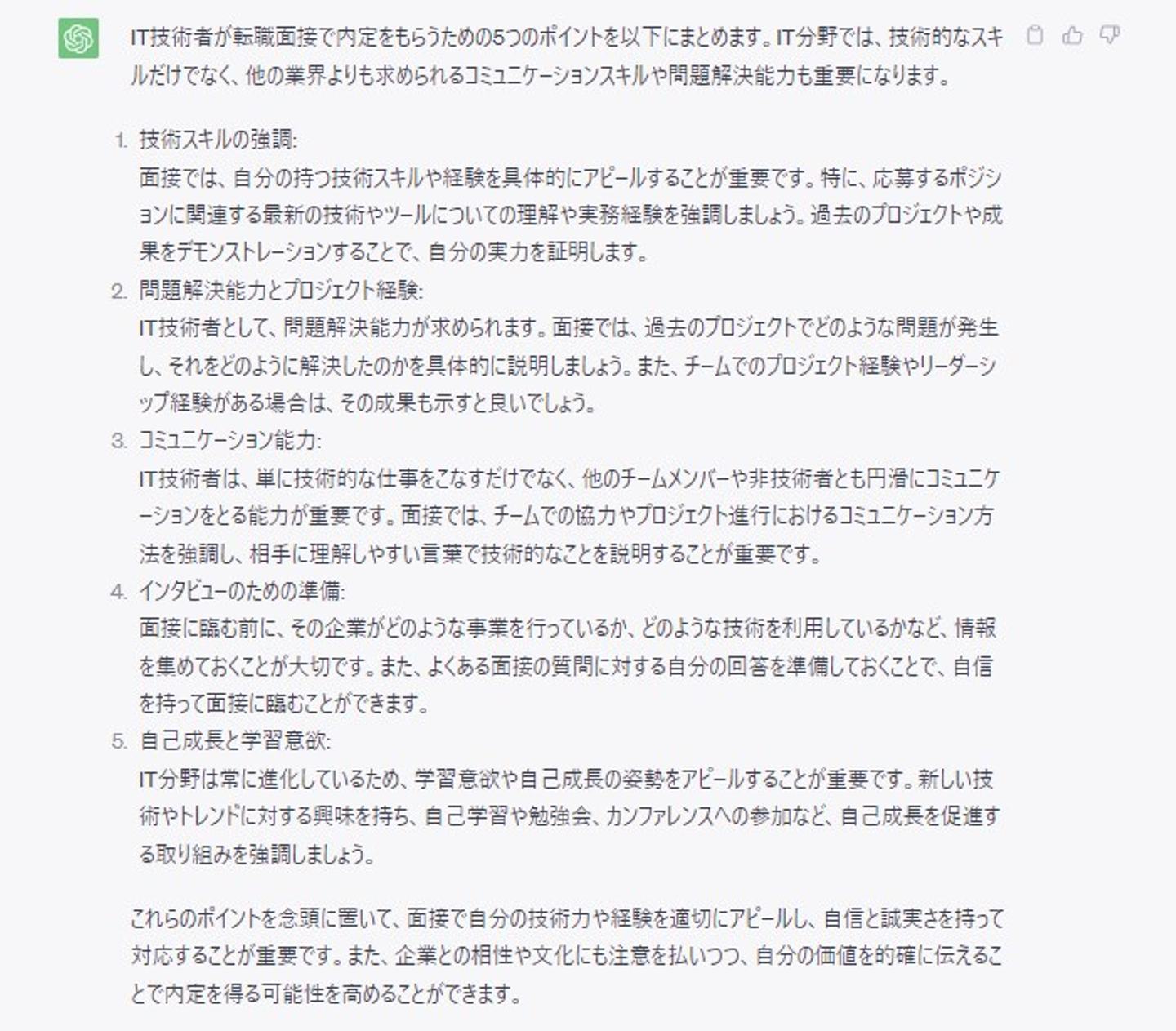 今回、ChatGPTに質問した内容は「IT技術者が転職面接で内定をもらうための5つのポイント」です。