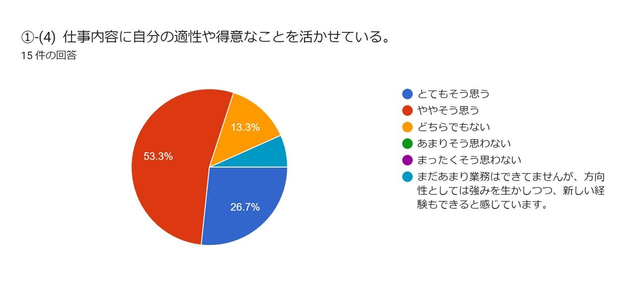 この質問において、「活かせていない」と応えた人は0人。8割が、自分の適性を活かして仕事ができていると答えました。「ベンチャーらしく、自身のこれまでの経験やノウハウから得意なことをアピールし、それを活かす場を提供してもらえるのはとてもやりがいにつながる」「得意な英語力を活かせている」「行程作成など自分の得意領域を極めることができている」