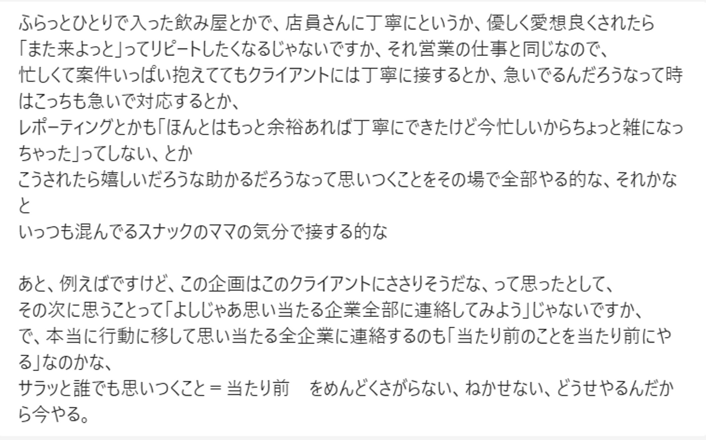 杉山さんの「当たり前」。当たり前の言語化。「いつも混んでるスナックのママの気分」とはとても杉山さんらしい。