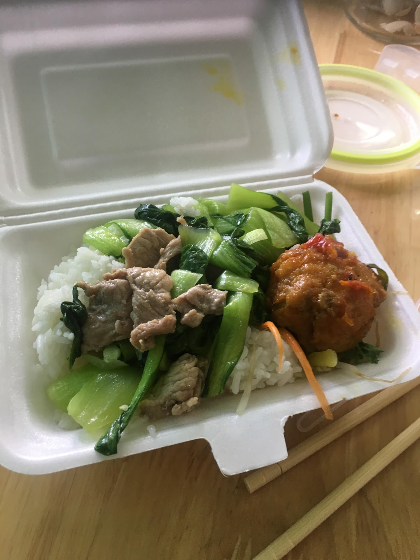 (今日のメニュー:ご飯、トマトソースフィッシュボールとチンゲン菜豚肉炒め)