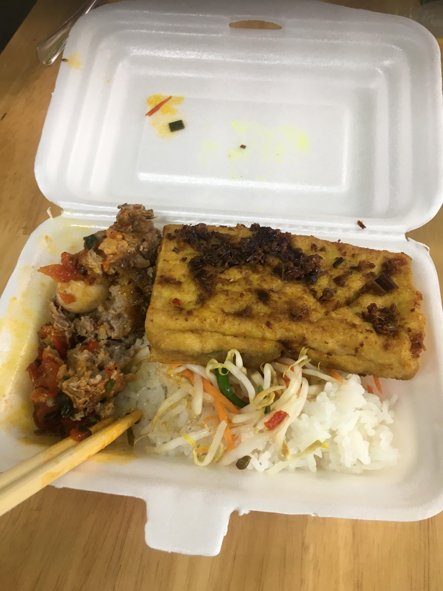 (Cơm trưa hôm nay: Cơm với thịt xay và đậu phụ chiên)