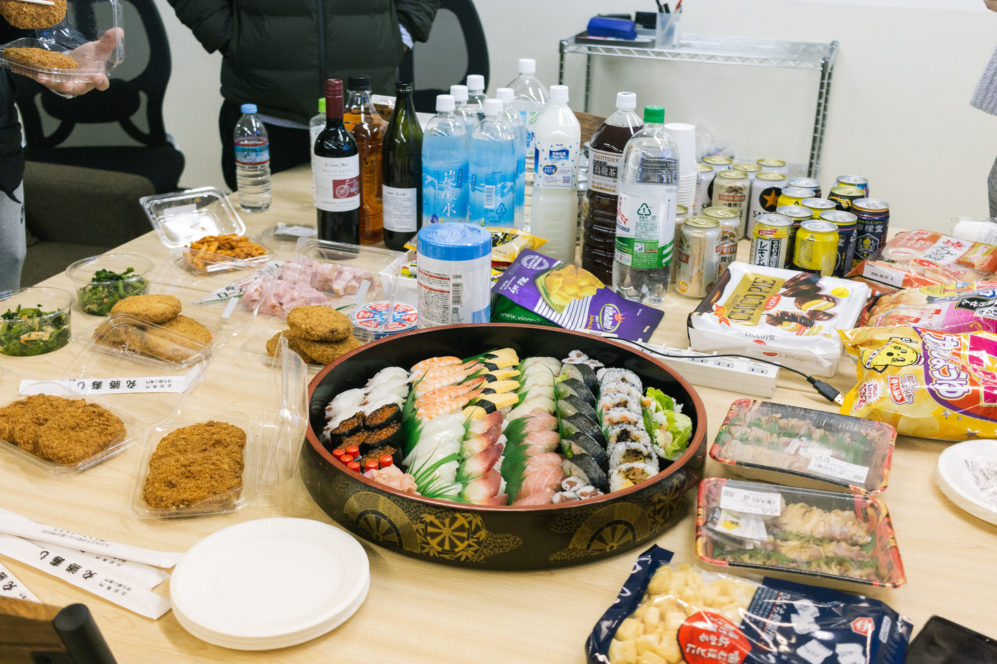 まず、イジゲンBUILDの忘年会ですが、12/19(木)に行いました。だいたい、BUILDの飲み会はオフィスで行われます。今回もオフィスで行ったため、いつも通り買い出しと注文をして、就業後の19時すぎよりスタート。とりあえず写真におさまらないほど、お酒とお菓子おつまみの量が凄かった、、!そして乾杯の写真がめちゃくちゃ楽しそう、、!写真にはないですが、ケン●ッキーのチキンを久しぶりに食べることができて美味しかったです。
