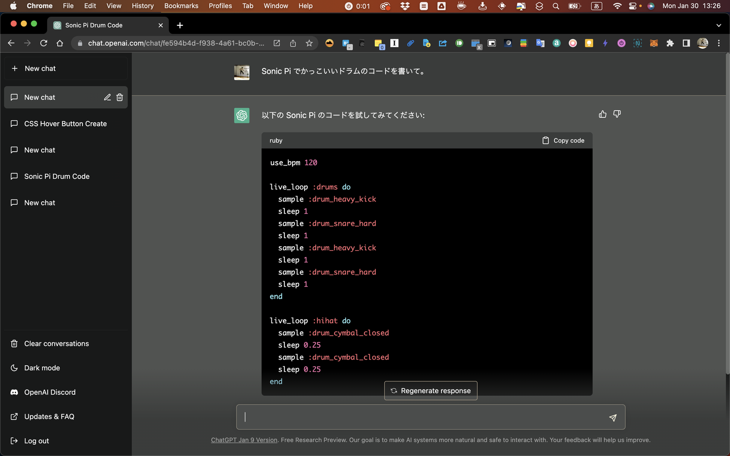 まずは、ChatGPT に「Sonic Pi でかっこいいドラムを演奏するプログラムを書いてください」とお願いします。ChatGPT が書いてくれたプログラムを Sonic Pi のエディタに貼って演奏開始。 (コード進行やメロディも同じように書いてもらうパフォーマンスもありかも)