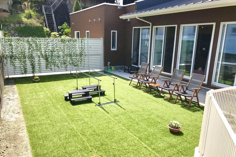 開放的な窓の向こうには人工芝を張った庭があり、なんと太陽の下で機能訓練が行なえちゃうんです!