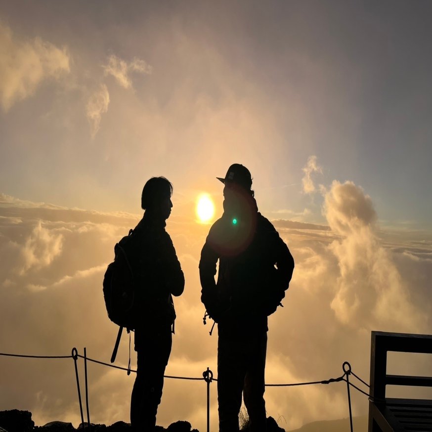 2022富士登山 新卒BIGプロジェクト時にご来光をバックに語り合う社長とメンバーです!☝