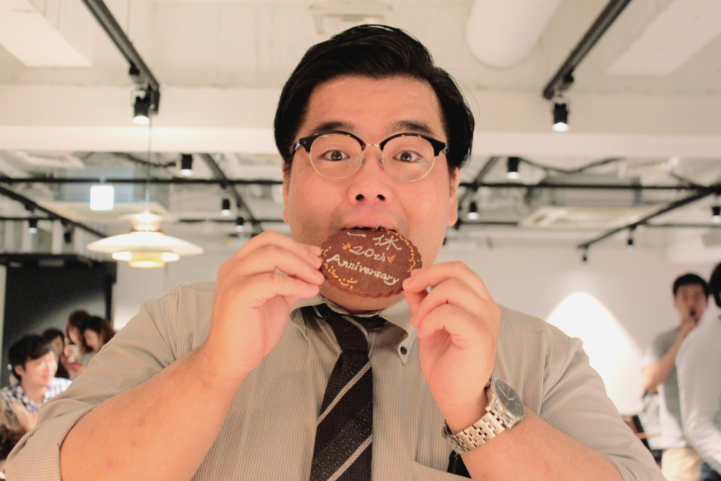 ≪レストラン事業本部≫ 1Q Awaed 受賞者の渡辺さん 受賞おめでとうございます!ということで、 記念ケーキのセンター部分に乗っていたクッキーは渡辺さんの胃袋へ!笑