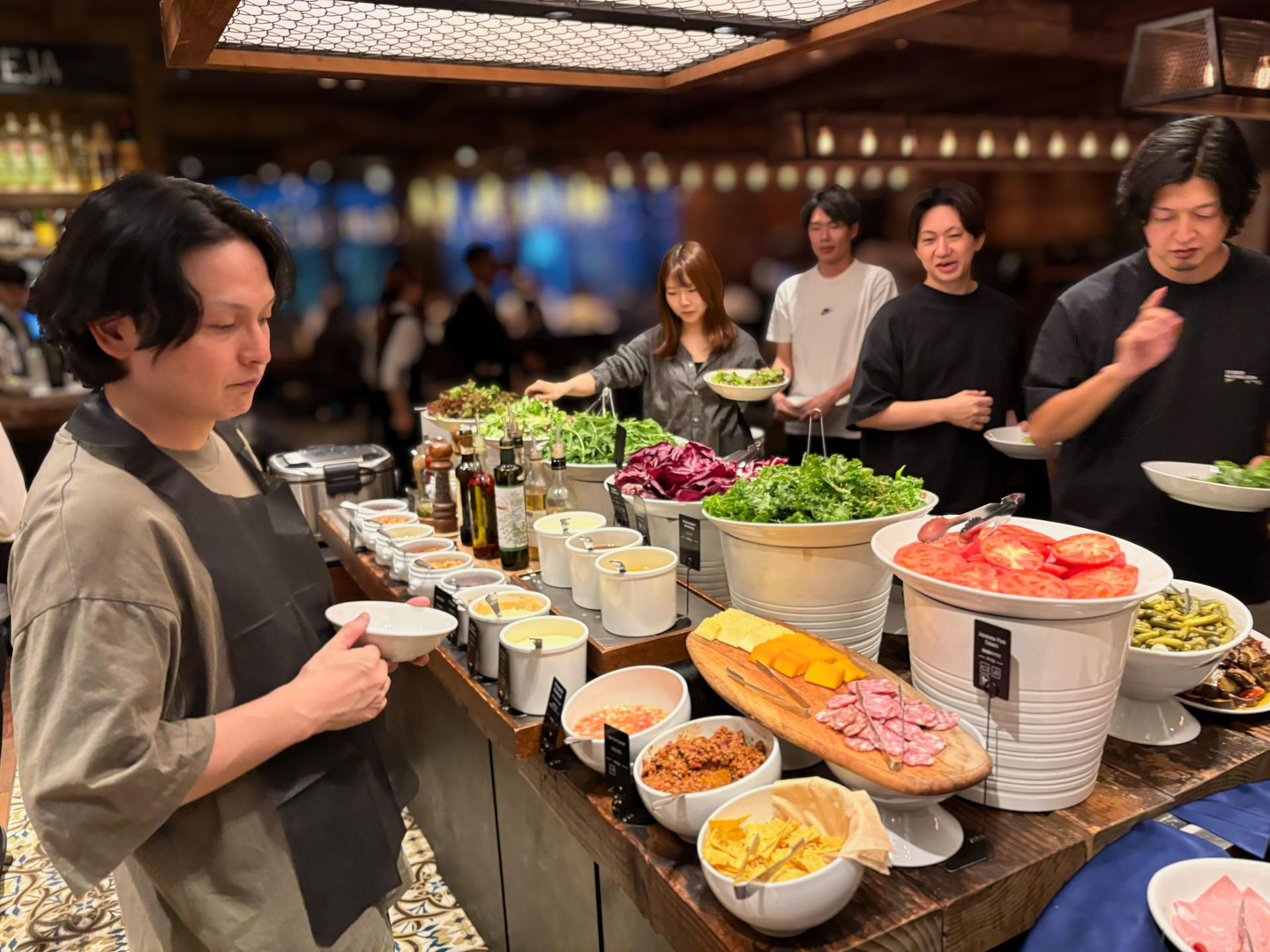 お肉はもちろん、カラフルなサラダバーやチーズ、デザートも充実。みんなでお皿を片手に「これも美味しそう〜!」「その組み合わせ天才!」とワイワイ盛り上がりました😸