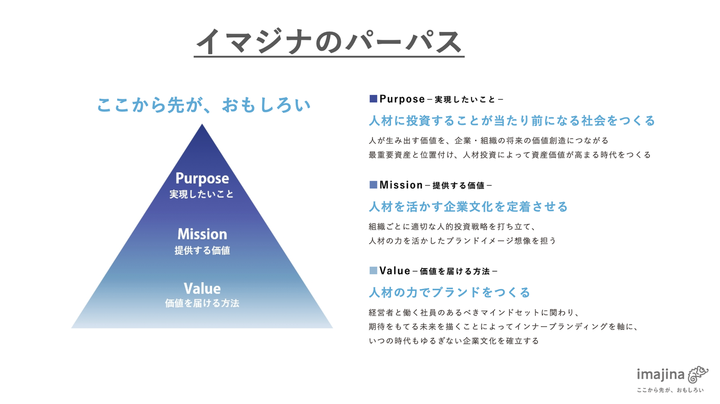 イマジナでは「人材に投資することが当たり前になる社会をつくる」をパーパスとして掲げています。