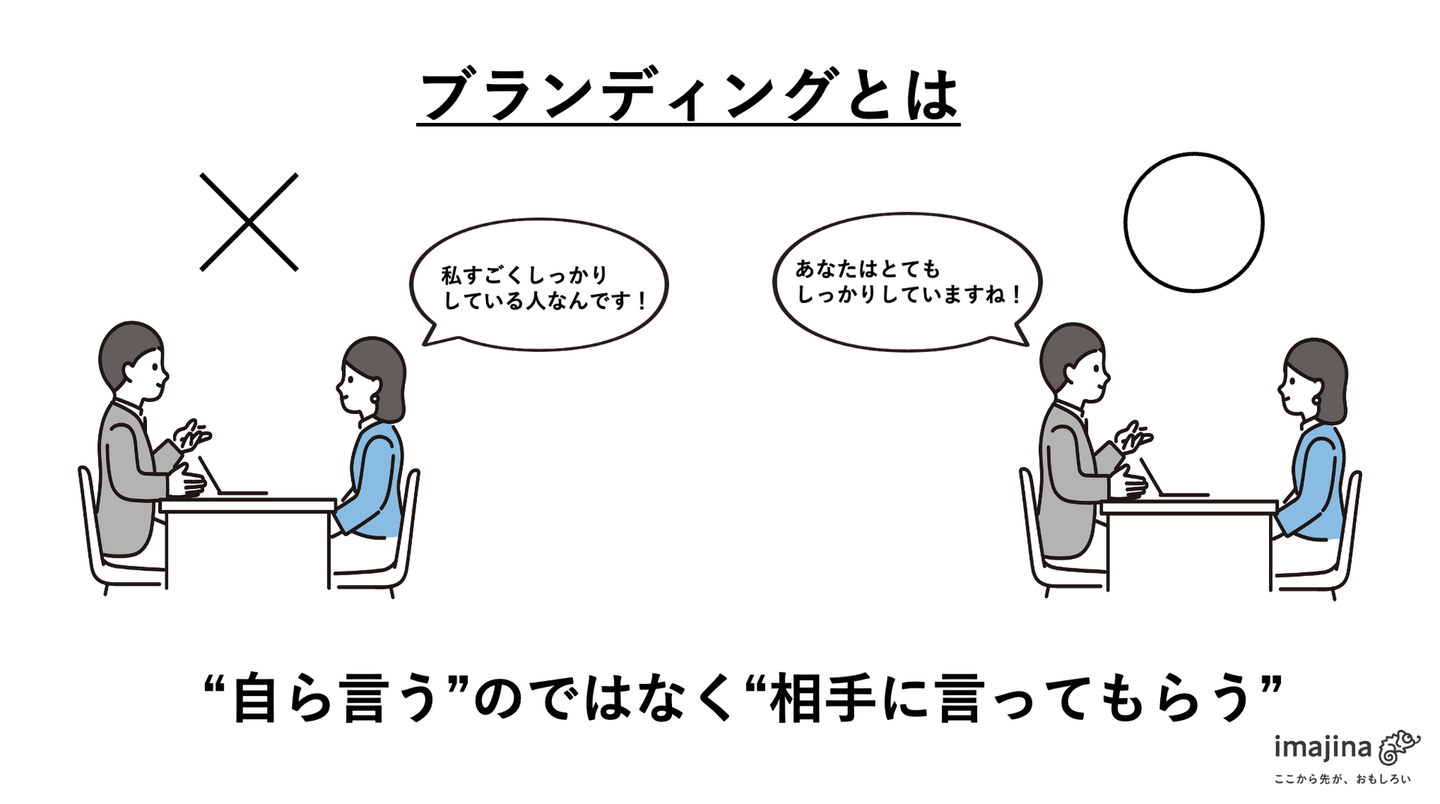 例えば、「私すごくしっかりしている人なんです!」と自分で言うよりも、授業に遅刻せず、しっかり課題を提出し、良い成績をとっている姿を見せることで、「あなたはしっかりしているね」と言ってもらうことにより、あなたは「しっかりしている人」というイメージを持ってもらうことができます。これがブランディングなのです。