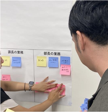 最初のワークでは、「課長・部長の違いは?共通する業務は?」の問いをもとにグループ毎に違いを整理しました。