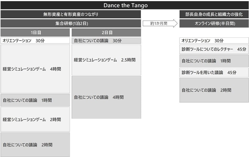 モデルプログラムのエッセンスを「Bite-size(ひとくちサイズ)」にアレンジし、半日から1日で感じていただく体験会。今回は部長がリードする「見えない資産」である無形資産の開発に焦点を当てた「DANCE THE TANGO」の圧縮版です。