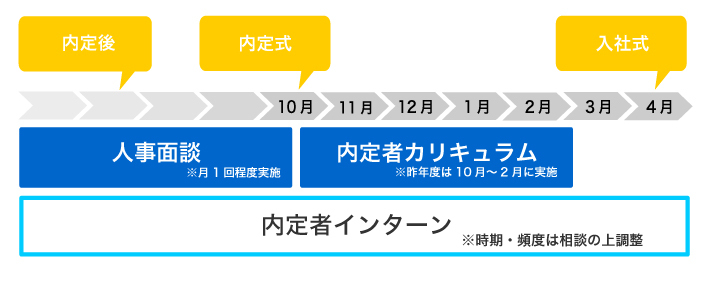 内定者インターンは、内定承諾から入社までの間で実務を経験する制度です(有給・任意)。実施の時期は、適宜調整します。