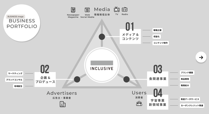 2007年創業以来、出版社、テレビ局をはじめとしたメディア企業や事業会社のデジタルトランスフォーメーションを推進してきたINCLUSIVEは「コミュニケーション」を主軸とし、デジタルメディア関連事業、食関連事業、人工衛星データ活用事業などを展開しています。