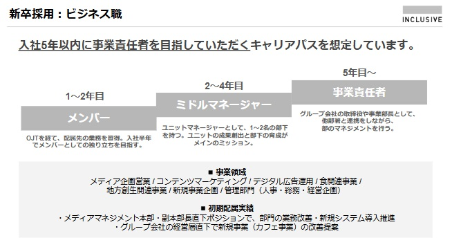 INCLUSIVEに新卒でご入社いただく方には、「入社5年以内に事業責任者になる」キャリアパスを目指していただきたいと考えています。