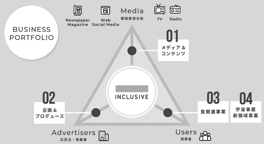 2007年創業以来、出版社、テレビ局をはじめとしたメディア企業や事業会社のデジタルトランスフォーメーションを推進してきたINCLUSIVEは「コミュニケーション」を主軸とし、デジタルメディア関連事業、食関連事業、人工衛星データ活用事業などを展開しています。