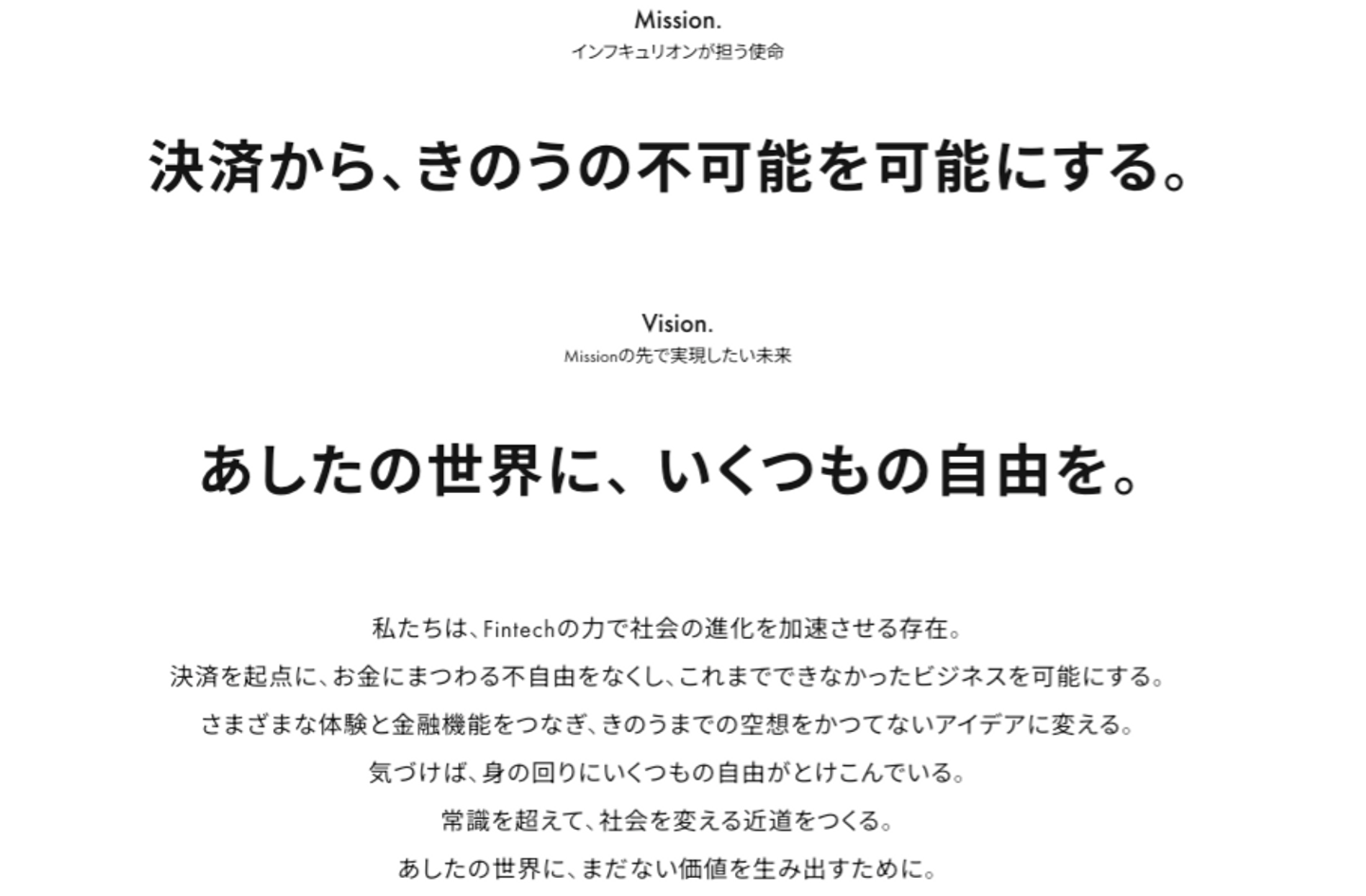 つまり「決済」は、あらゆる消費体験を変えていくための入口であり、世界を変えるキーワードです。その決済分野において、私たちインフキュリオンが世界の重要な役割を担うという覚悟を示すためにも、ミッションに「決済」という言葉を入れました。