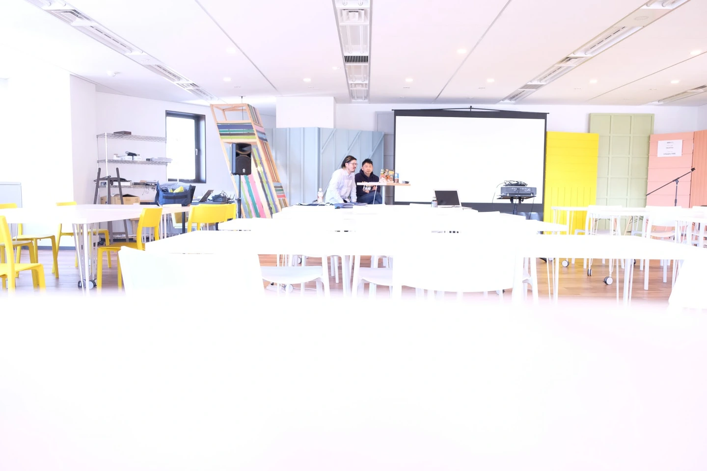 学生さんは40名ほど参加してくれました。通常の説明会と比べて倍の人数です。これだけ多くの人が集まっても、ステージ上では「咳をしてもひとり」、いや、ふたり。