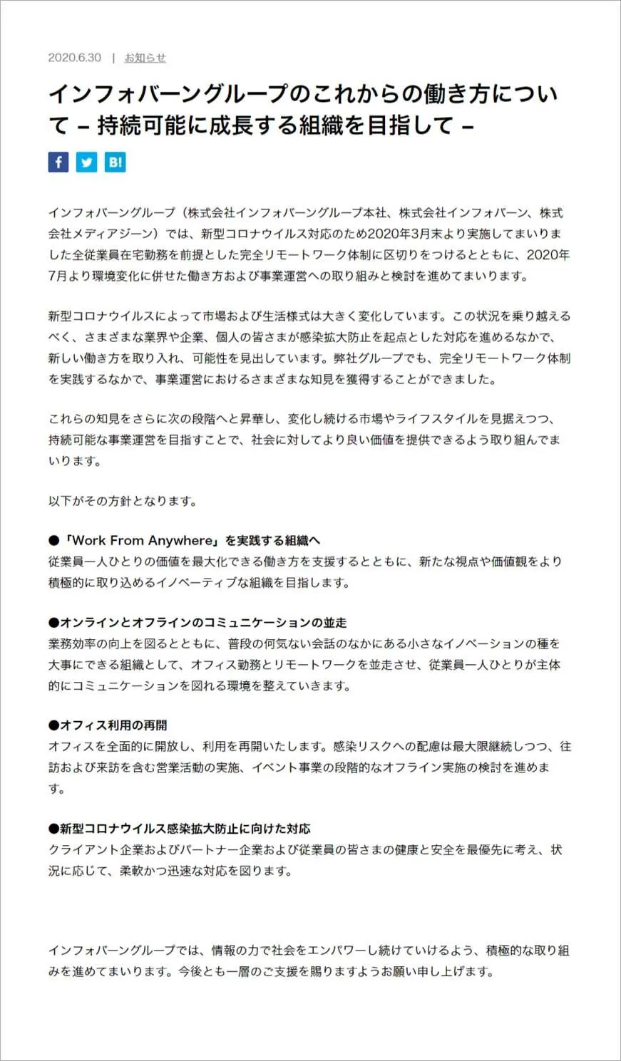 緊急事態宣言は解除されたものの、今もなお感染者は増え、油断できない状況が続いていますが、2020年7月を迎えるにあたって、インフォバーングループでは、今後私たちがどのような働き方を選択していくのか、という方針を出しました。