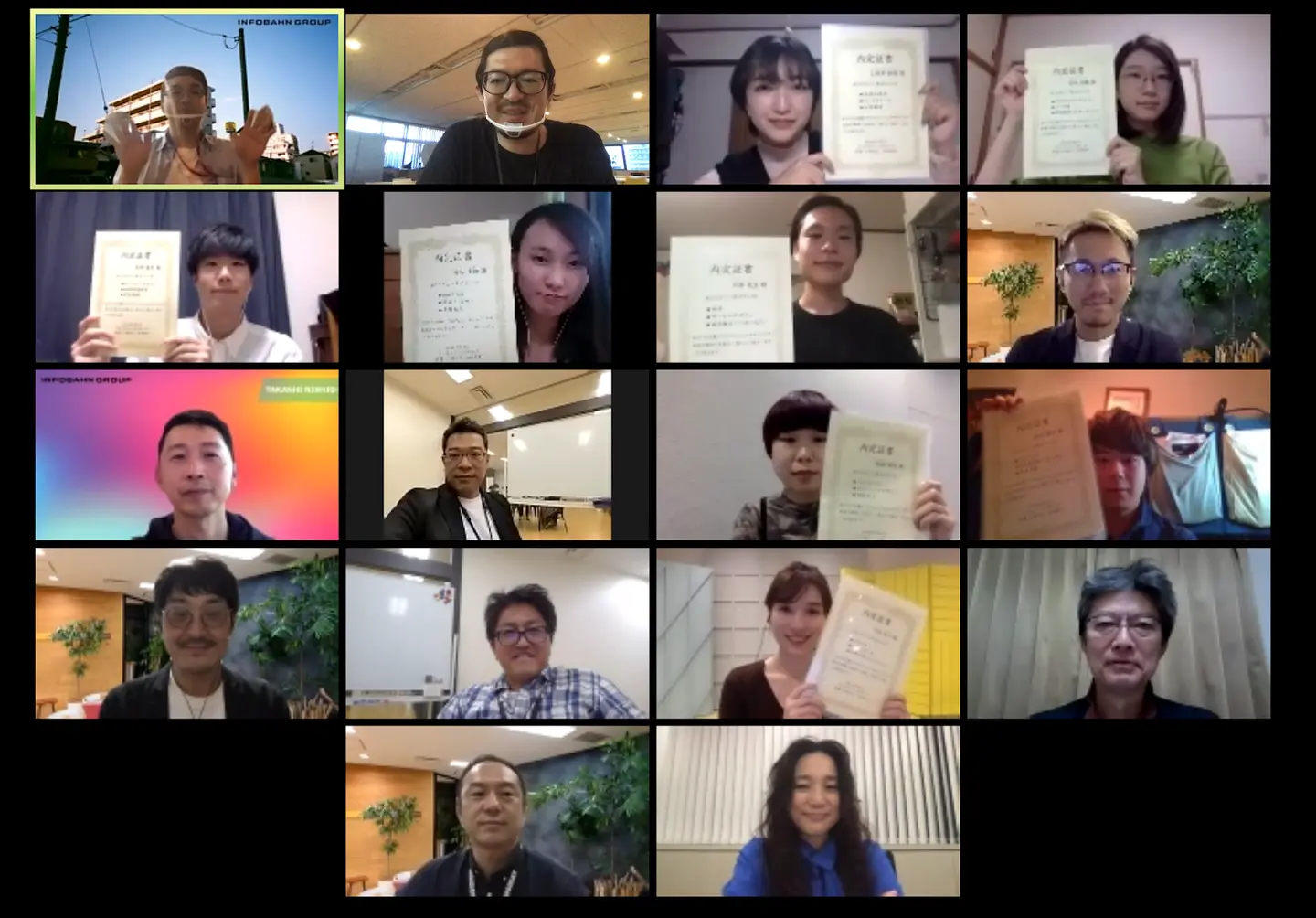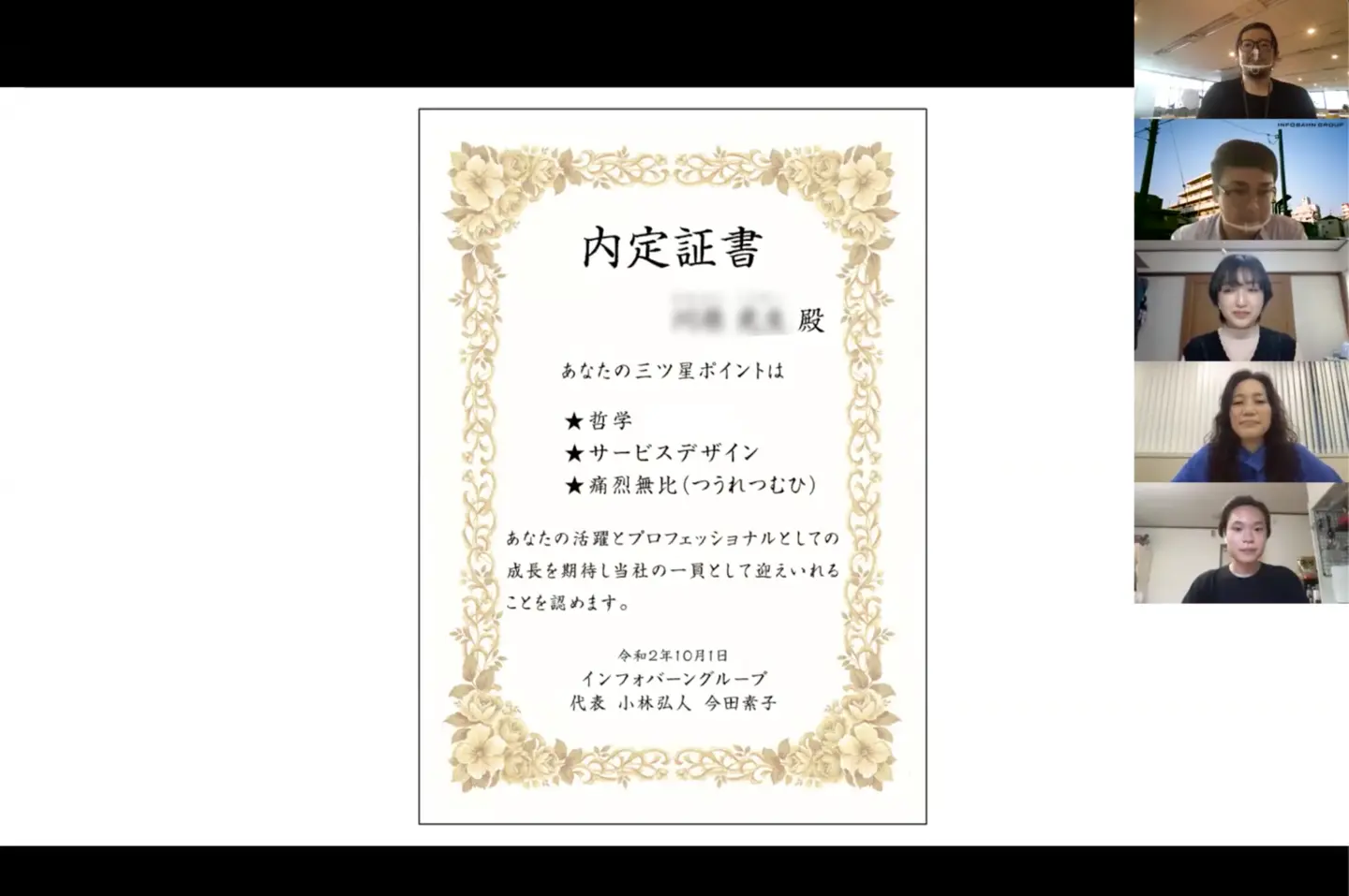 じつは内定者のみなさんに事前に内定証書を郵送していたのです。その場で小包みを開けてもらい、カメラでパシャリ(スクショですが)。オンラインならではの演出です。