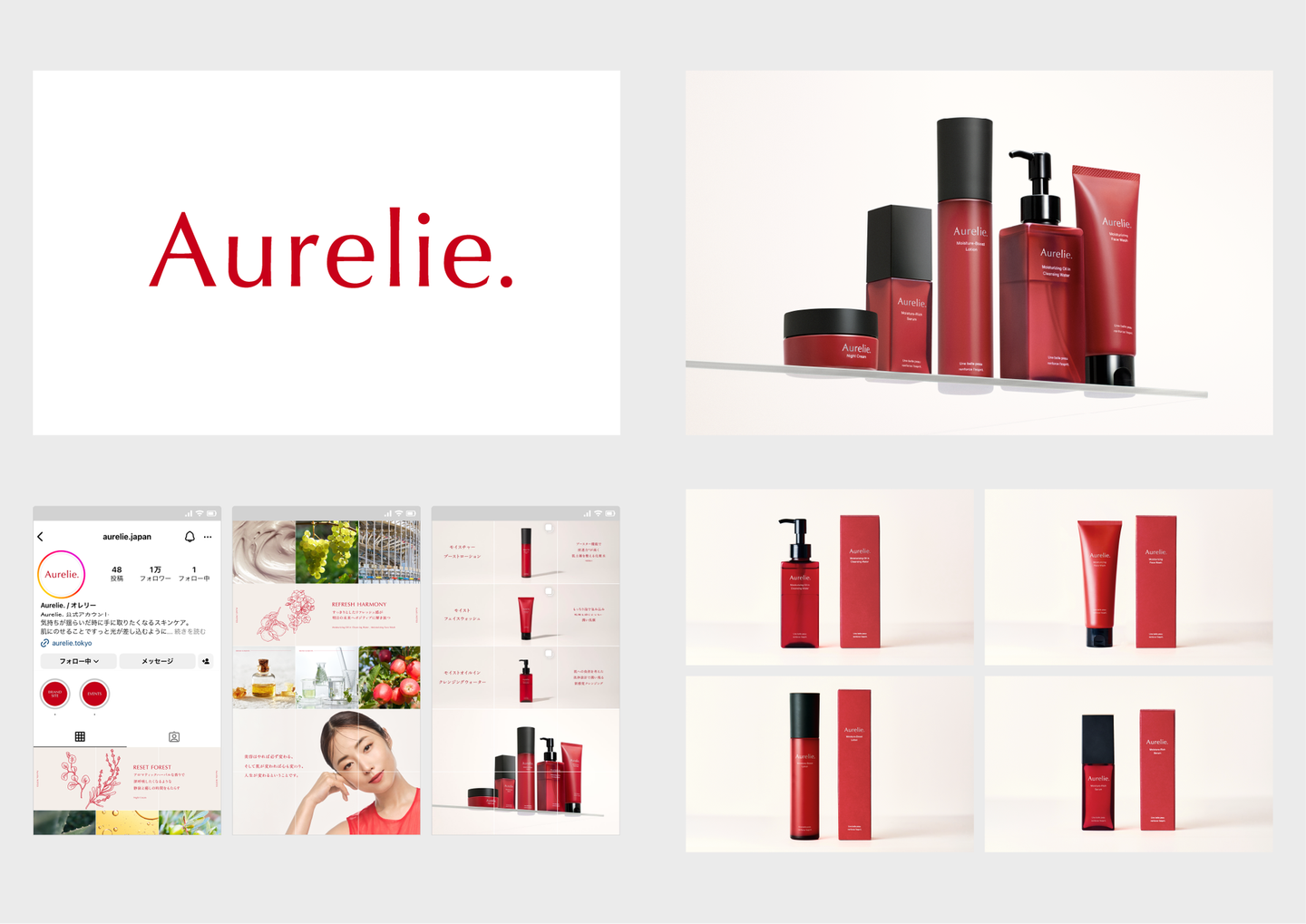 例えばパッケージデザインや各種クリエイティブに取り入れているキーカラーは、Aurelie.レッドを基調にしたもので統一しているのですが、これはMEGUMIさんの想いでもある「女性が自信やオーラをまとうような赤」をベースに、多種多様な赤から決定しました。