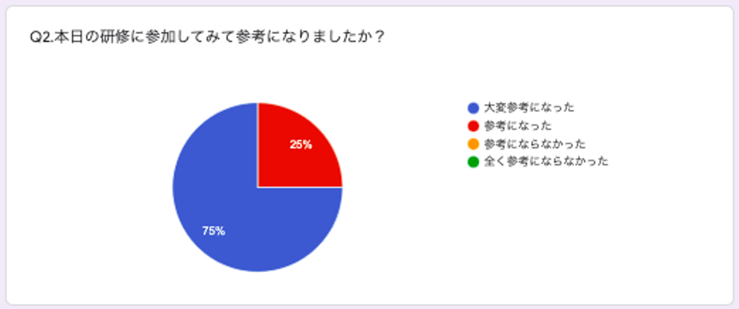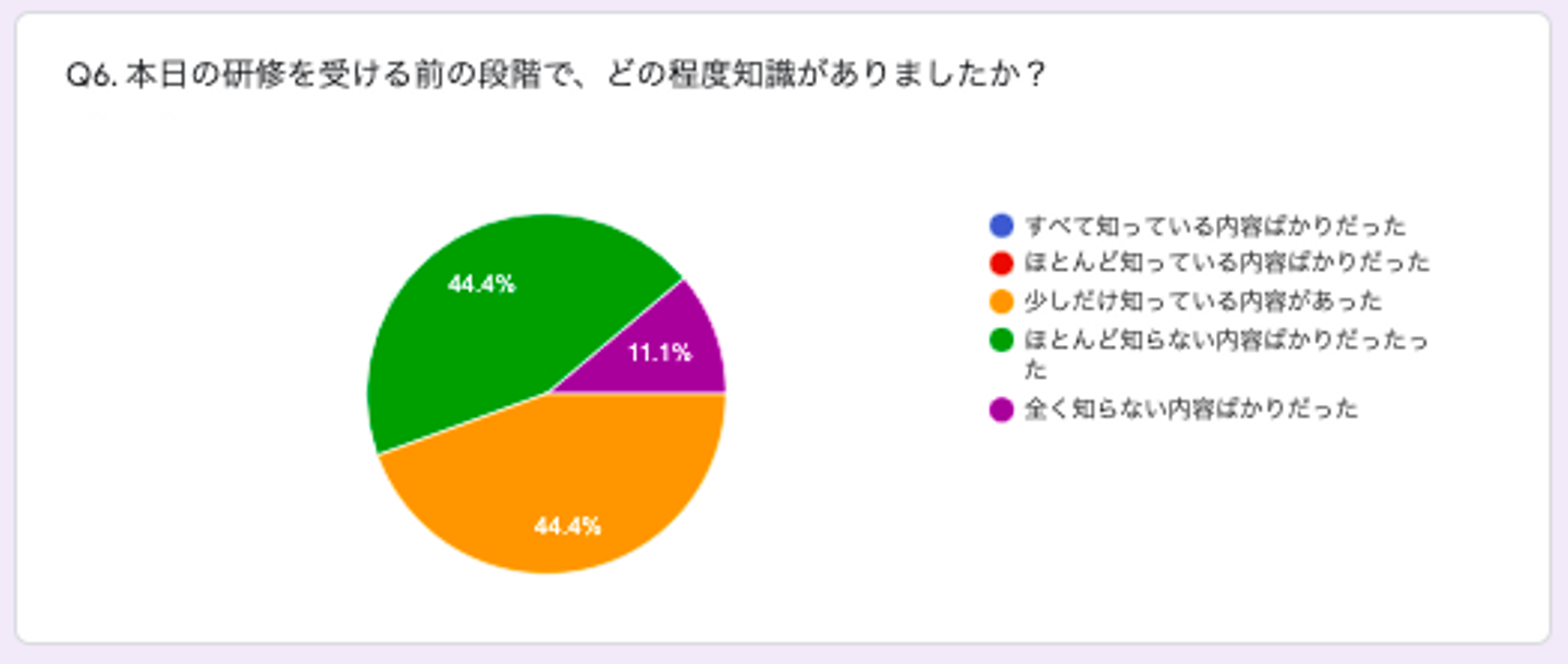 研修を受けるまで知らなかったという方が多数!そして全員が参考になったという回答していましたので、今回の研修は、個人の意識も、会社としての力もかなりUPできたと思います!