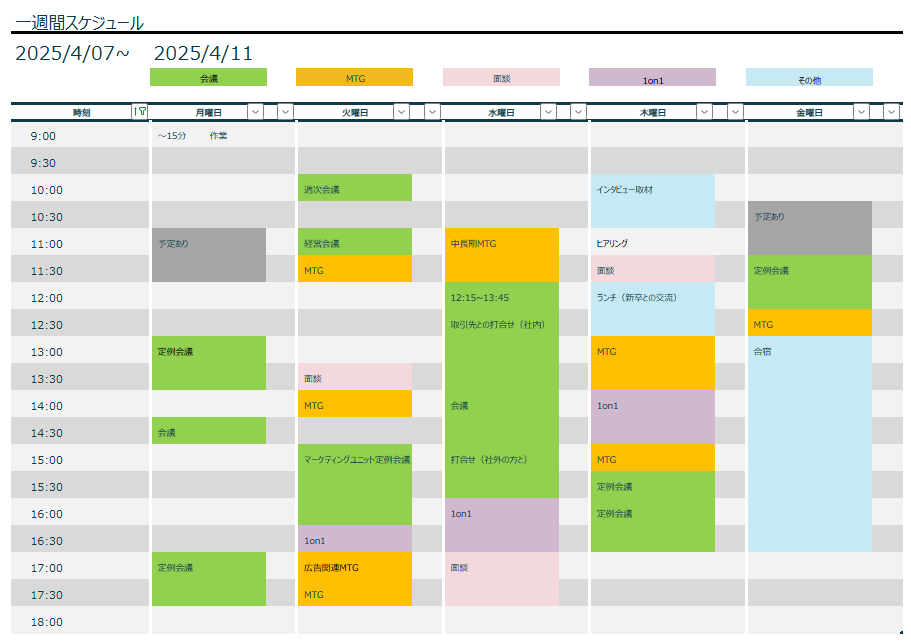 (少し仕事のイメージがつきやすいように、ある一週間のスケジュールを教えていただきました!部下のマネジメントを行っているため、会議やミーティングが多いですね。また、スケジュールも分刻みで多忙な様子が伺えます。)