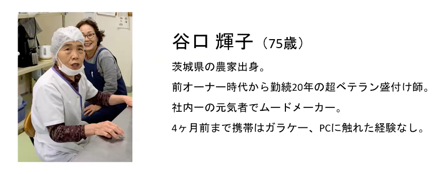 出来上がった仕組み、DXという仕組みを使いこなそうとするのでなく、今ある組織ができることを考えればいい。そういう仕組みを作ればいいと、発想の転換をしました。注目したのが、彼女、谷口輝子さん75歳。御年75歳です。