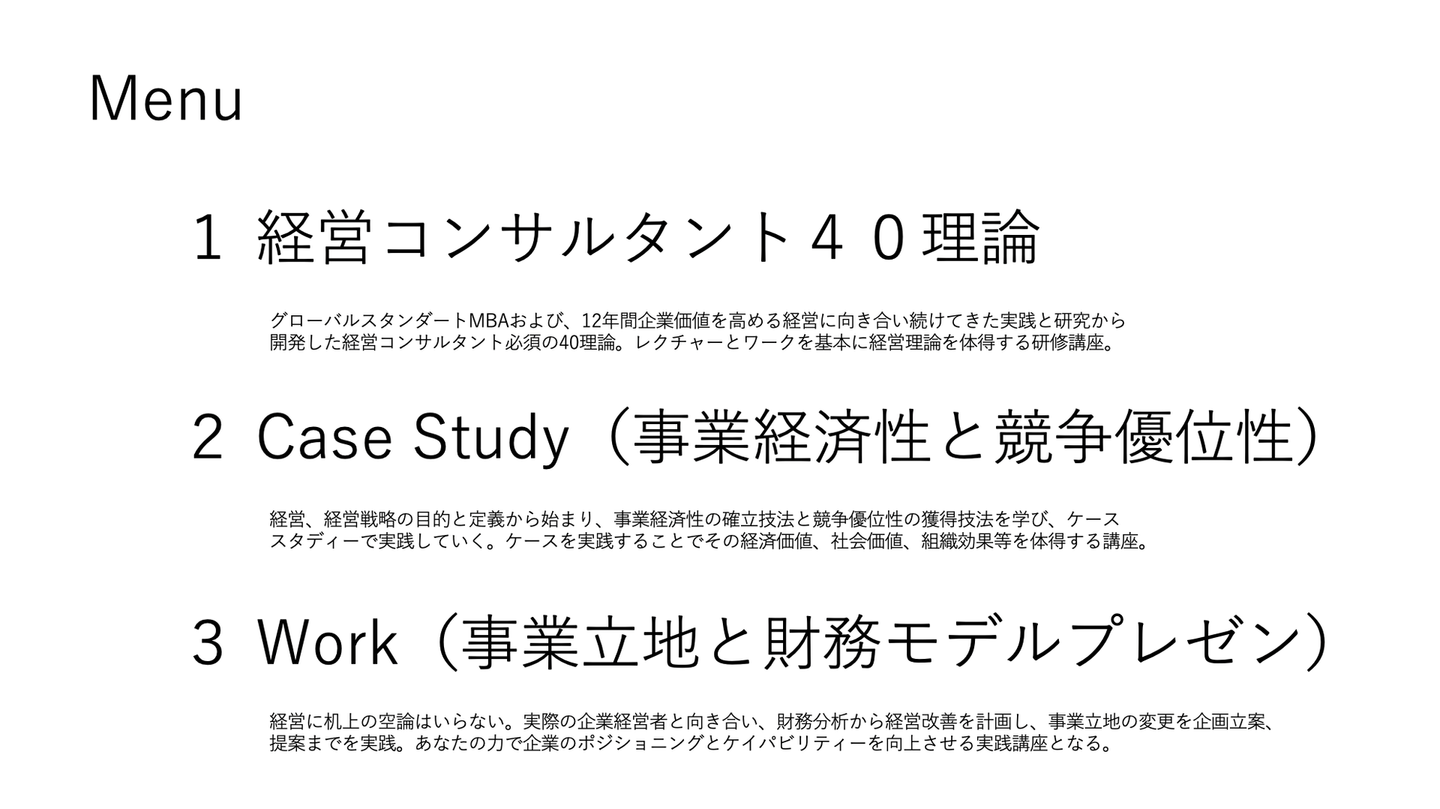 経営コンサルタント研修、経営コンサルタントのマインドブック、40理論レクチャー、財務分析、ケーススタディー等を実施し、実際の経営コンサルティング案件に参画していただく「本物の経営スキル養成講座」です。