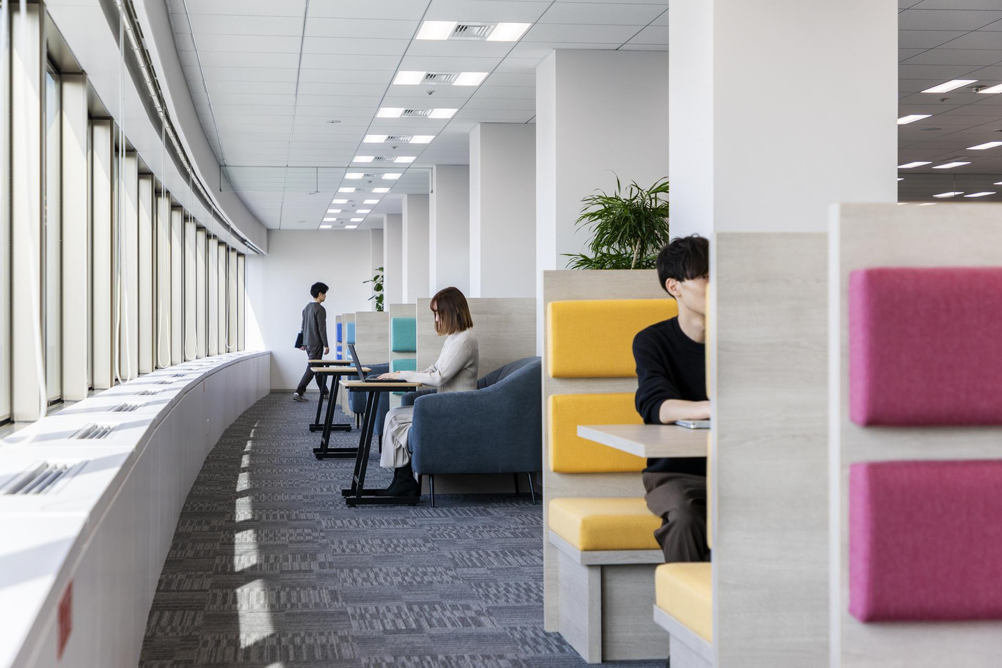 作業スペースには、気軽に打ち合わせができるボックス席を設置しています。ちょっとした相談や意見交換に活用され、チーム内のコミュニケーションをスムーズにする場となっています。また、1人用の作業スペースもあり、集中して業務に取り組むことが可能です。さらに窓に面しているため、自然光を感じながらリフレッシュしつつ作業を進められる環境が整っています。