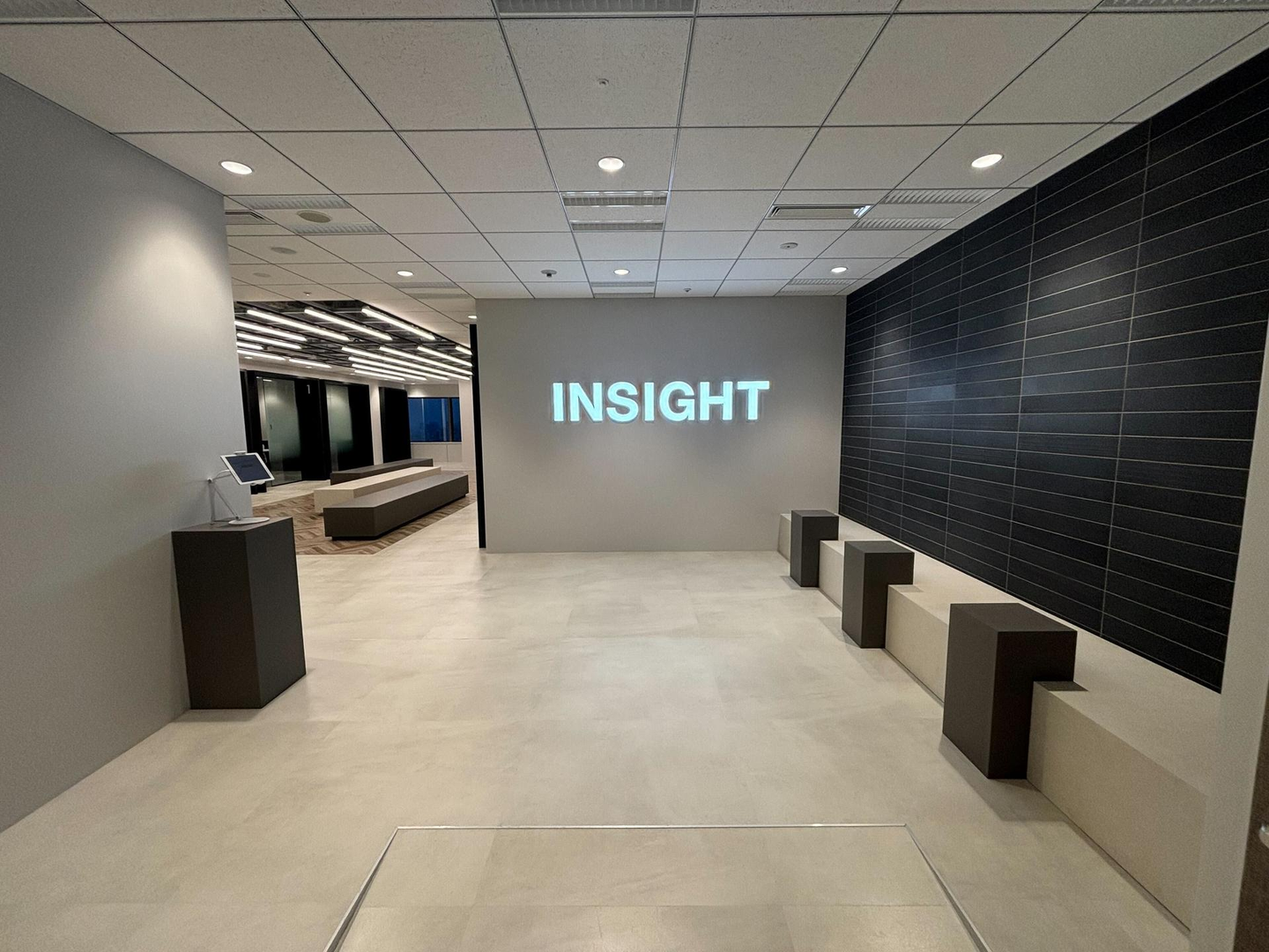 エントランスは、コーポレートカラーであるモノトーンを基調とし、シンプルで洗練された空間に仕上げています。正面にはINSIGHTの大きなロゴが配置され、来訪いただいたお客様や求職者の方をお出迎えします。