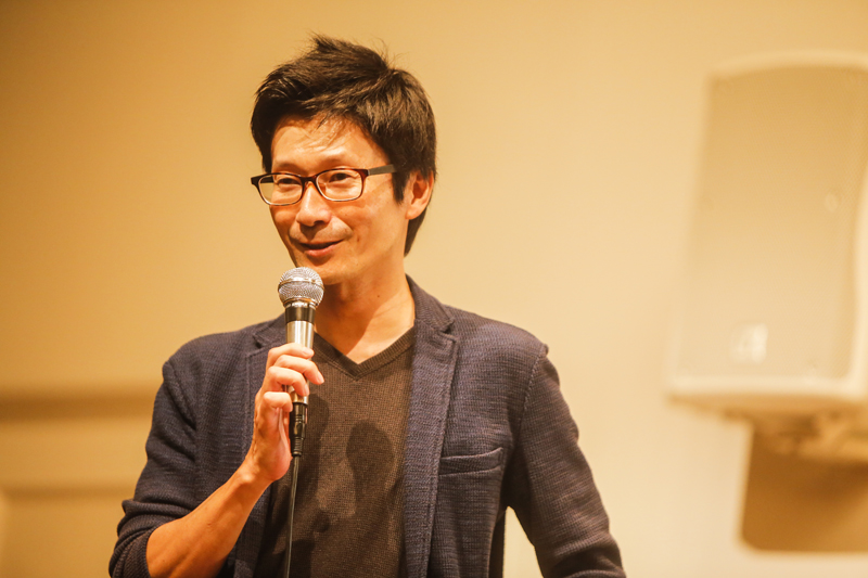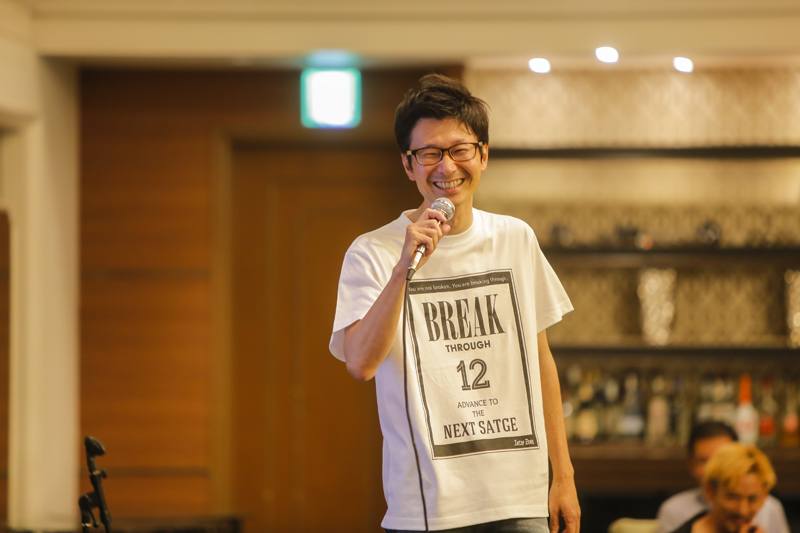 社員総会の懇親会にて、出し物の司会をする鏡山社長