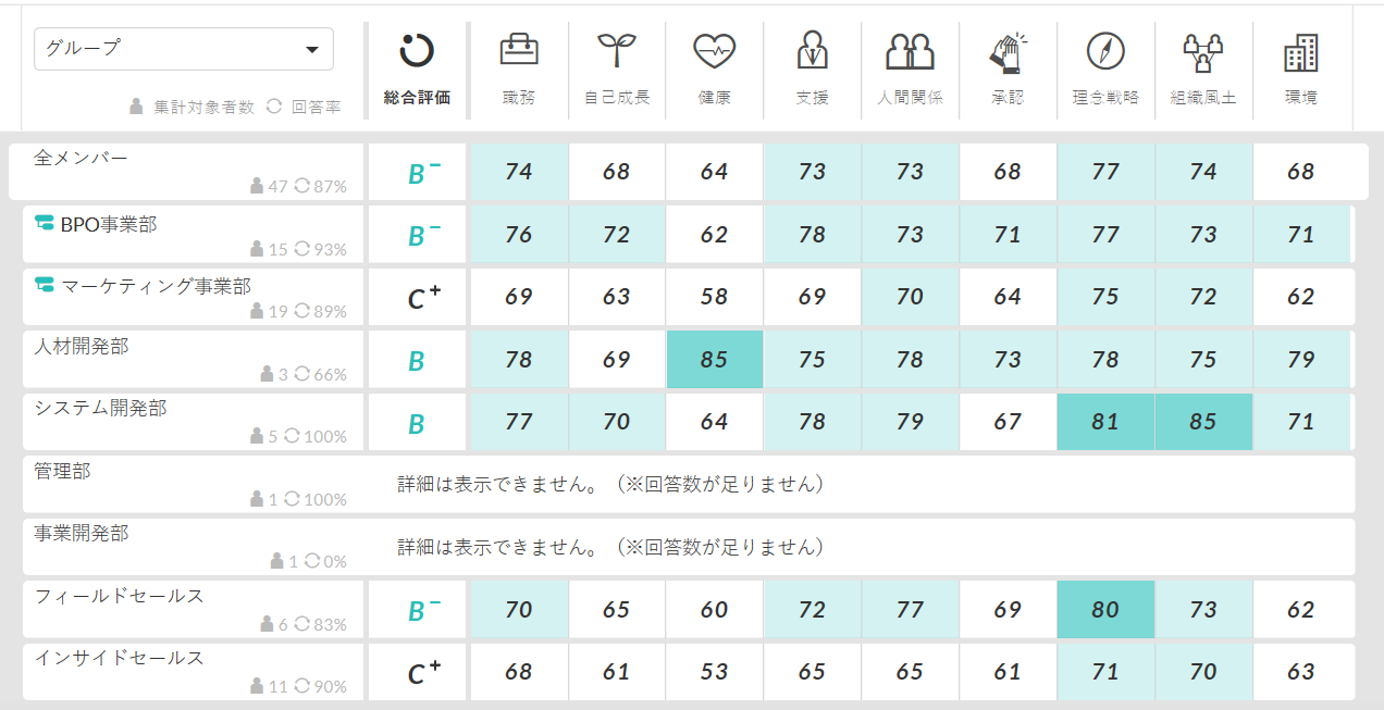 カテゴリーは9つの項目に分かれています。「職務」「自己成長」「健康」「支援」「人間関係」「承認」「理念戦略」「組織風土」「環境」で、それぞれのスコアが別々に出てきます。これまでの結果を見ると、「人間関係」「理念戦略」「組織風土」が高いのがインターゾーンらしいところだと言えますね。