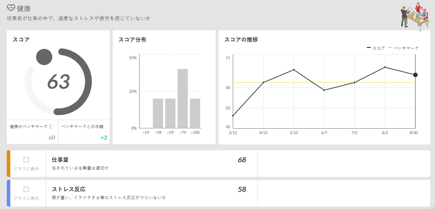 さっそくチームミーティングを開いてwevoxの結果を共有すると、メンバー全員が同様の悩みを抱えていることがわかりました。そこでチームの方針を変えて、積極的に時間を作って個人が抱えているストレスや仕事に関する悩みを話し合うようにし、仕事のボリュームを適正化していきました。数カ月後には、同チームのスコアは47から66と、20ポイント近くも上昇しました。