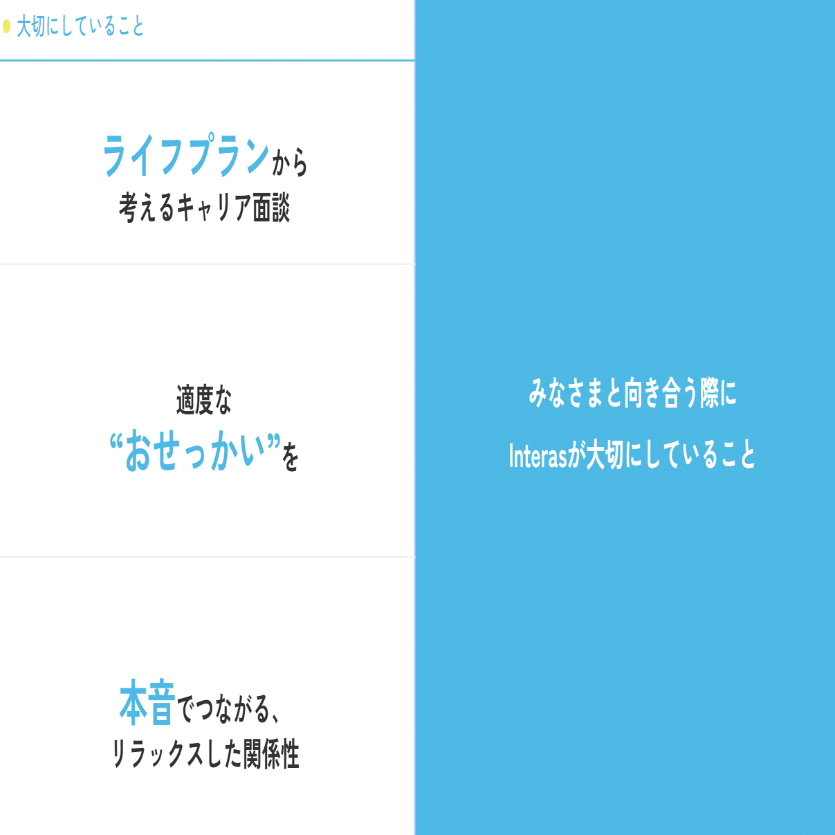 『Interas』は皆さんのキャリアや人生設計を全力でサポートします。転職相談はもちろん、ライフプランの設計、副業体験なども、柔軟にお手伝いしています。一人で抱え込まず、ぜひお気軽にご相談くださいね。