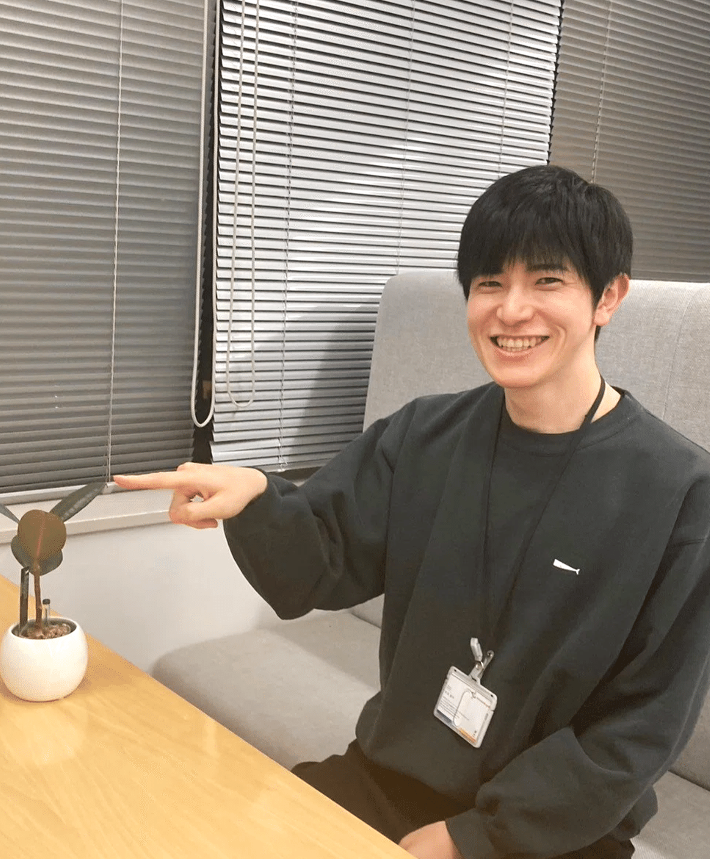 撮影では、入口前の植物をバックににこやかな笑顔でパシャリ📷とてもユニークで、まるで寒澤さんが茜さす日の一輪の花みたいですよね!「株式報酬制度」の導入から運用まで紆余曲折ありつつも、目的意識をもたれて意欲的に業務に取り組まれていることがわかりますね!