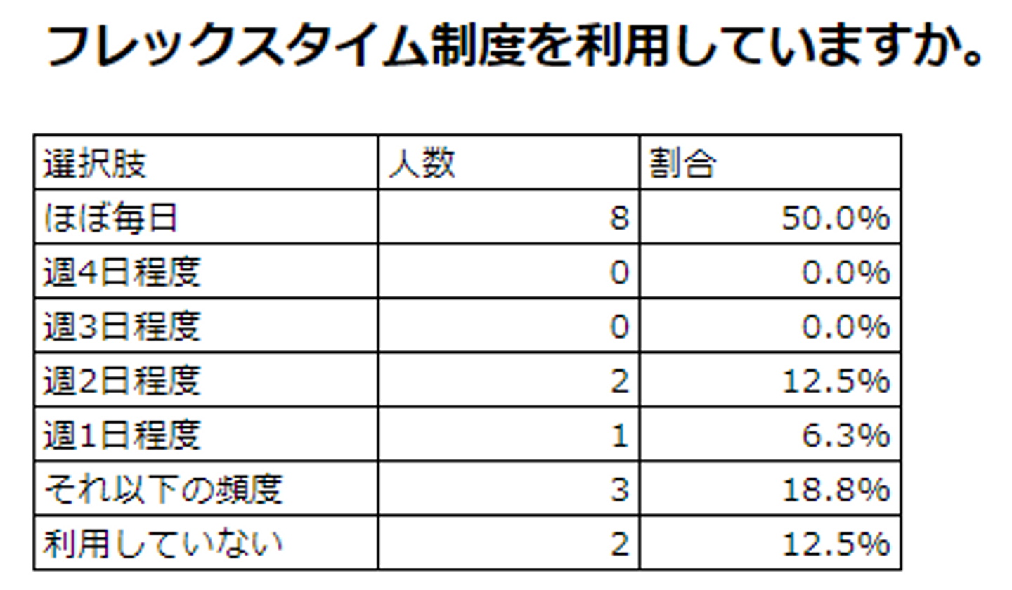 次に、フレックスタイム制度の利用状況について質問したところ、次のような結果となりました。